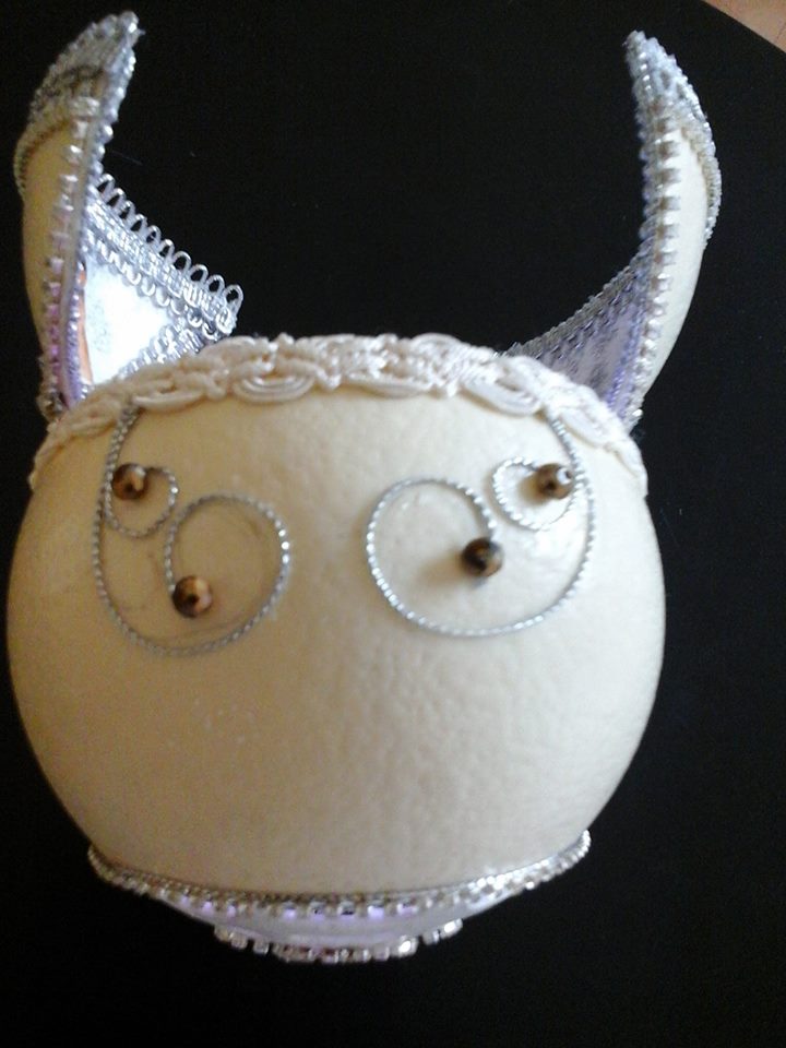 Huevo de avestruz con técnicas especializadas aquí talle un corazón con vidrio de vitral dando forma Autora: Consuelo Hernández